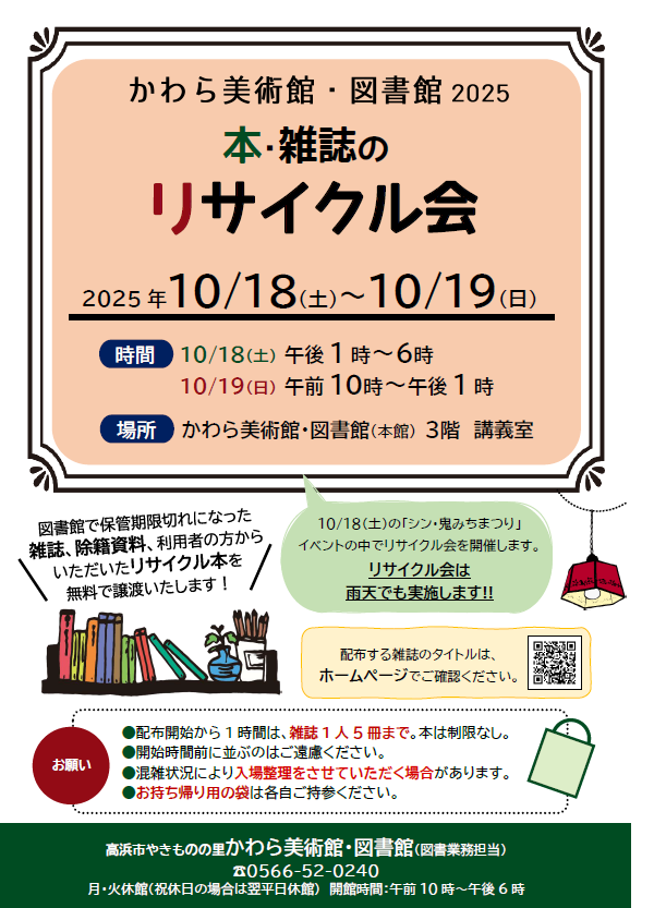 【イベント内容】市内のイベント「シン鬼みちまつり」にあわせて本・雑誌のリサイクル会を開催します!詳しくは図書情報サイトのお知らせをご確認ください。https://www.takahama-lib.jp/<外部リンク>